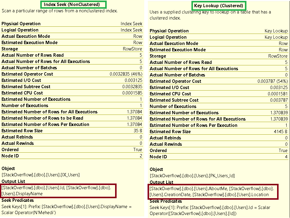 If you hover mouse on Index Seek and Key Lookup Operator of execution plan (Figure-3), it will show the tool tip menu like (Figure-5). The Index Seek operator only provides id & DisplayName and Key Lookup operator returns AboutMe, CreationDate, and Location.
