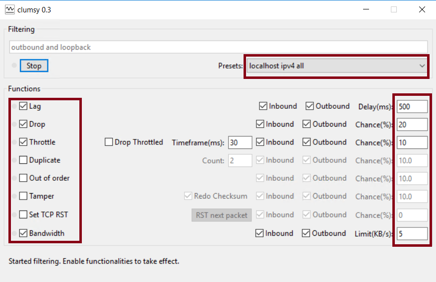 Now run Clumsy as Administrator and configure and run it as shown in Figure-3 to simulate network lag.