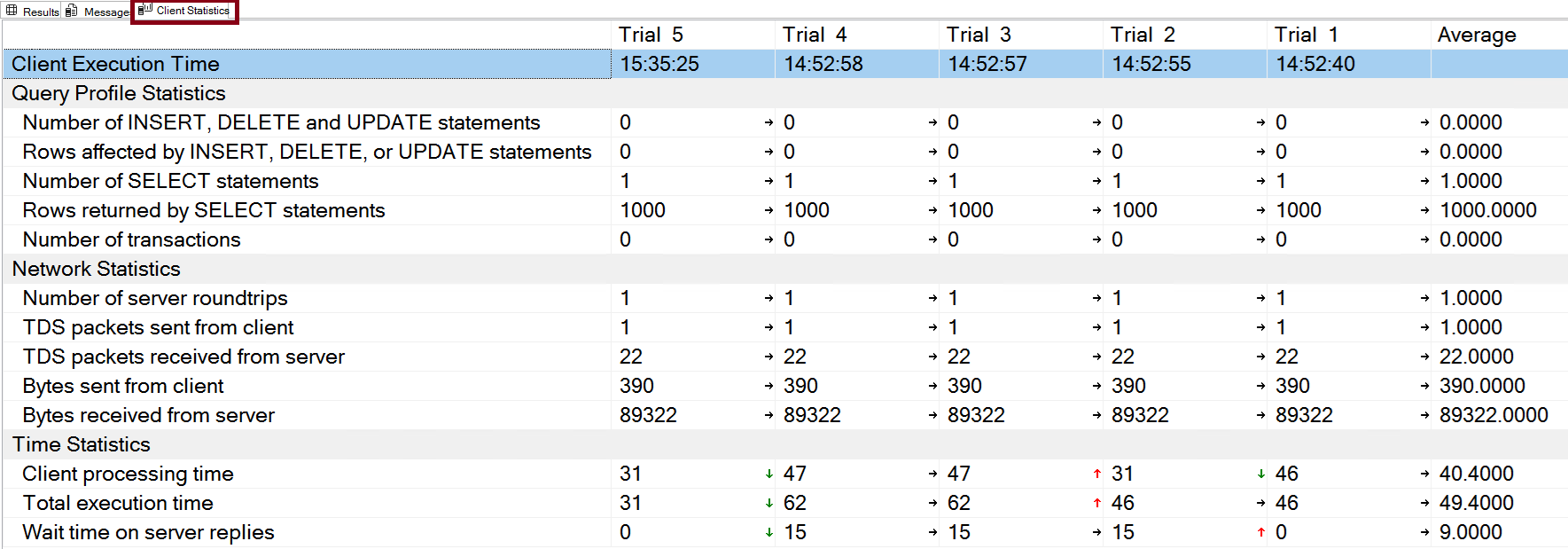This is a great tool to capture execution metrics from the perspective of client machine (from where the query is executed) as shown in Figure-4. It records the time it takes to transfer data across the network from client machine. Not the time involved on the SQL Server machine. This is particularly helpful for troubleshooting a query. Even it shows data if you trial the query multiple times. To configure client statistics, from SSMS go to Query menu->Include Client Statistics menu item.