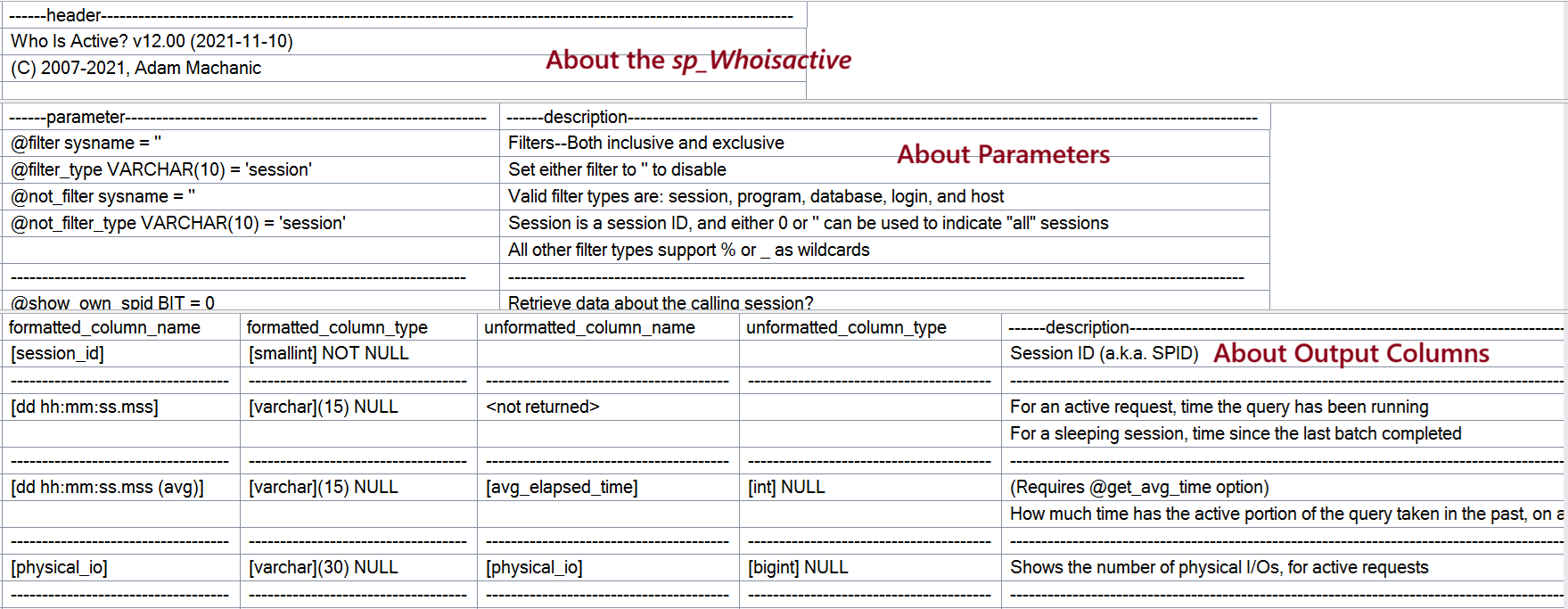 If you run sp_WhoIsActive without any parameters, it will retrieve following columns, broken into four basic categories: