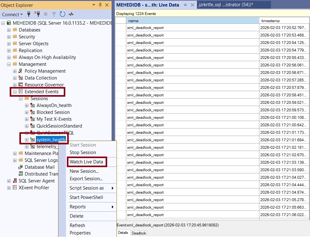 After running the above queries, right click on the system_health extended event and click on Watch Live Data. You will see many deadlocks in the system.