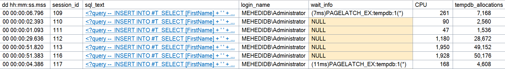 Now run sp_WhoIsActive, you will see lots of PAGELATCH_EX wait types in tempdb as shown below (Figure-5).