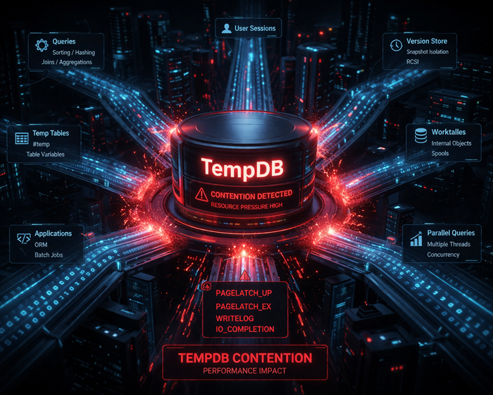 tempdb contention occurs when multiple sessions simultaneously try to access and use tempdb resources, leading to bottlenecks. Since tempdb is heavily used for temporary objects, sorting, hashing, and version store operations, high concurrency can quickly create pressure. A common cause is contention on allocation pages like PFS, GAM, and SGAM, resulting in waits such as PAGELATCH_UP and PAGELATCH_EX. Insufficient tempdb data files and poorly optimized queries can further worsen the situation. As a result, even if CPU and memory look normal, overall system performance can degrade significantly.