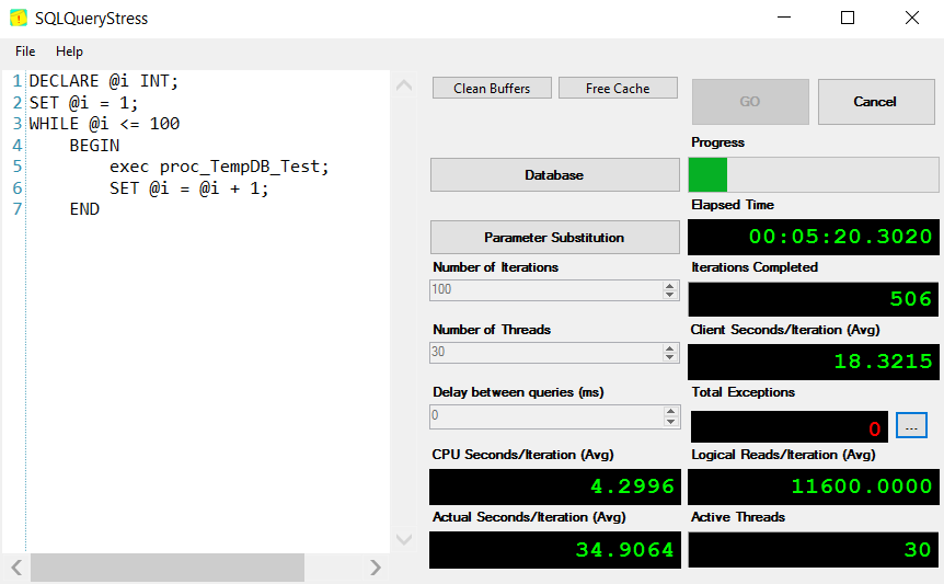 Connect the SQLQueryStress to your test database and put Query Snippet-3. It will generate artificial load (Figure-3).