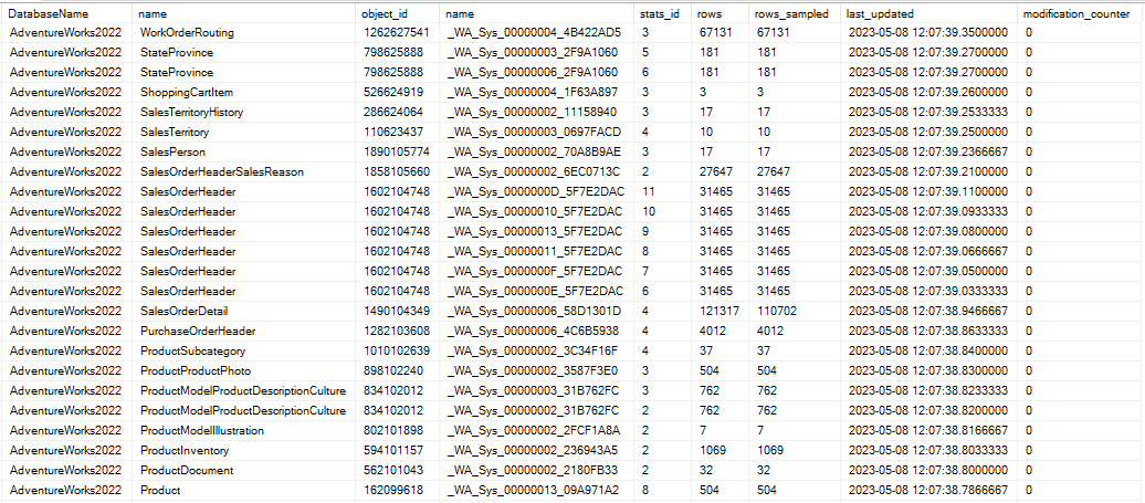SELECT DB_NAME() AS DatabaseName, o.name, o.object_id, s.name, s.stats_id, rows, rows_sampled, last_updated, modification_counter