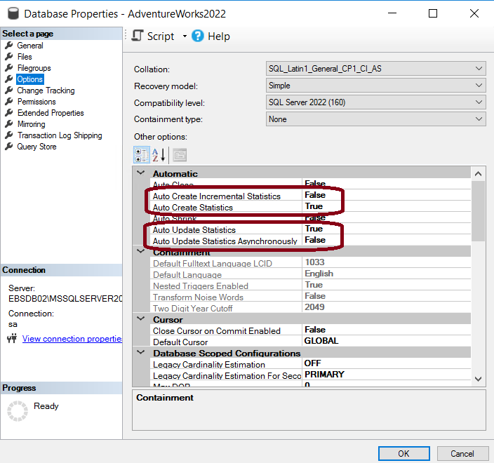 - Check Auto Create Statistics and Auto Update Statistics are set as True.