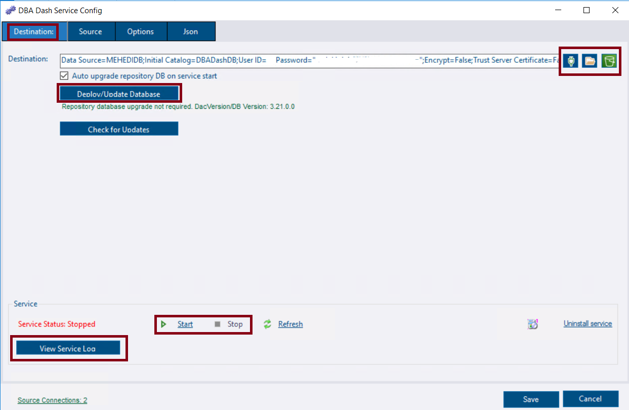 Figure-3: DBA Dash Service Configuration for Destination/Repository Database