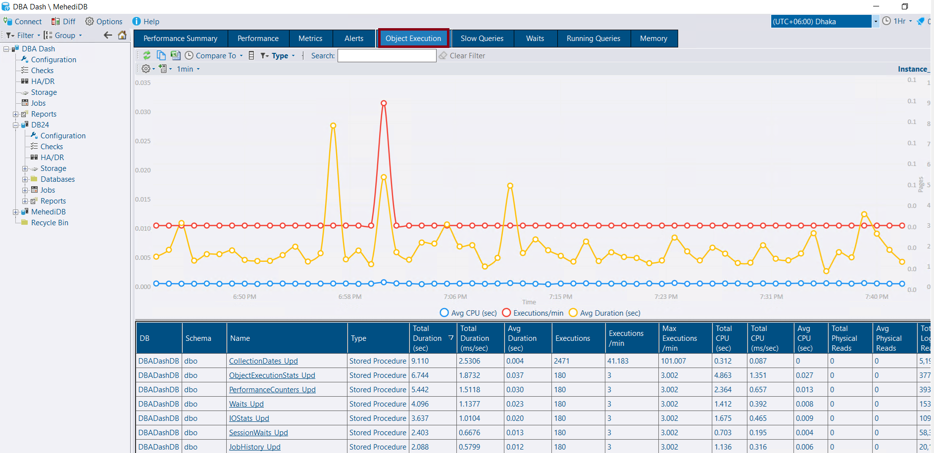 This window shows top stored procedures those are executing in your system over the period. You can track down which stored procedures are using the most CPU or IO, which are executed most frequently and which have the slowest execution times.