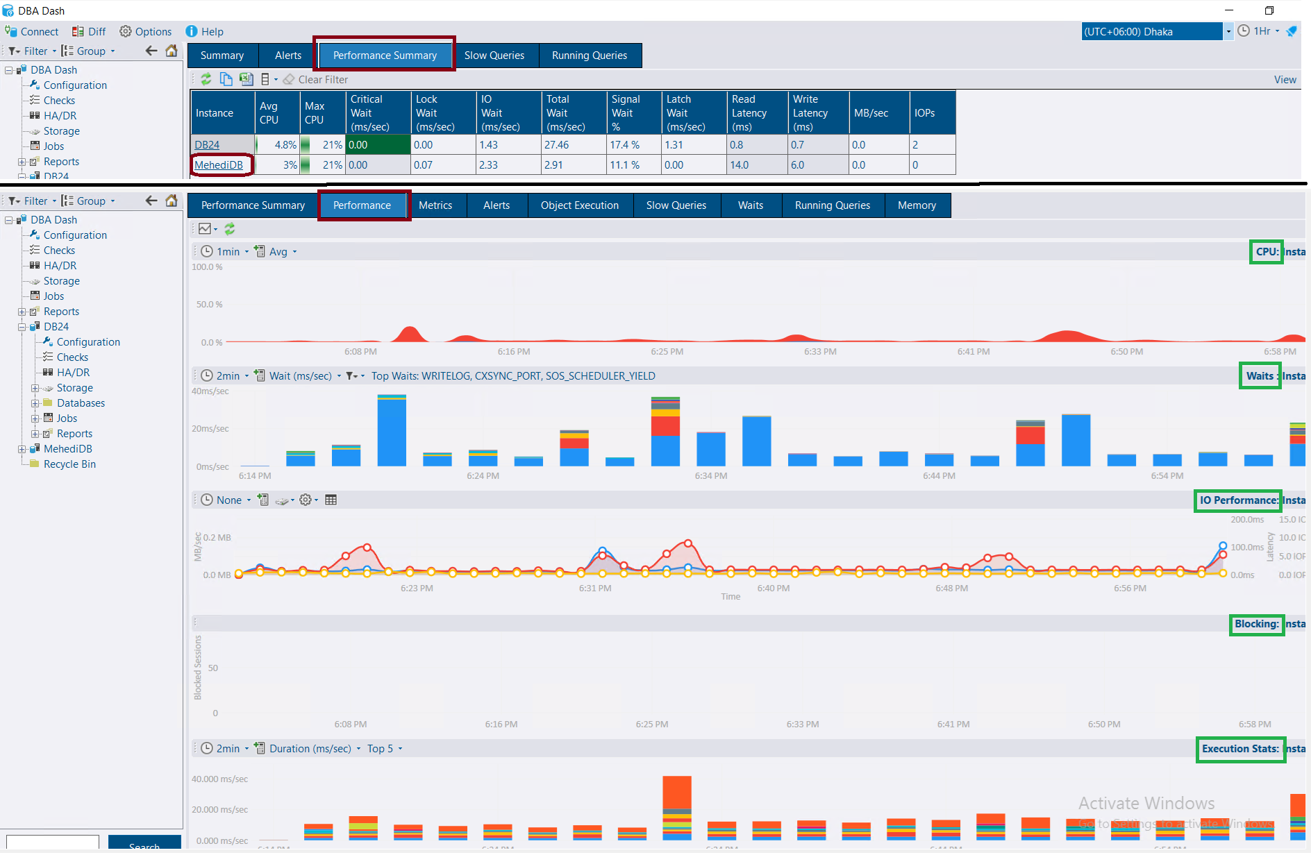 Clicking on Performance Summary will take you to a new window with individual instances. It shows critical metrics for all of your SQL instances on a single page. You can customize it by adding your important metrics. Clicking further on instance name will drive you to Performance window. Here you will see: