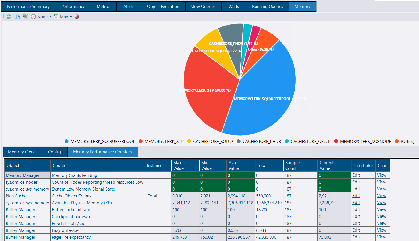 You can watch memory related performance under this tab. Check how memories were allocated to different internal parts and how memory clerks were using them over the period.