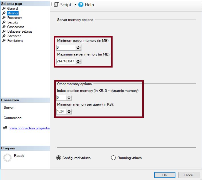 - Maximum(MB) - Default value is 2147483647 MB. It is the upper limit of that much memory can be acquired by SQL Server. It will reserve sufficient memory for the SQL Server. The default value allows SQL Server to use as much as the memory required. It might consume almost all OS memory that may result in server performance issue.