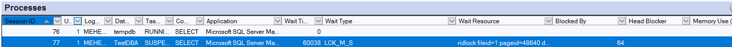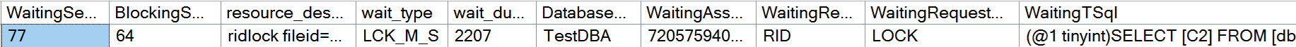Let's open three query windows in your SSMS and paste below queries in three windows (Table-4). First run window-1 query, then window-2 finally window-3. It will display information about waiting session id, blocking session id, resource description, wait type, wait duration, waiting and blocking query like figure-3.