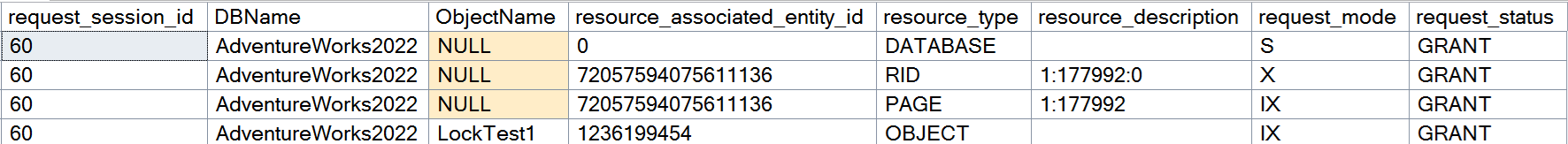 - resource_description - For the RID type this column represents as FileID:PageID:Slot(row). In this case, it is 1:177992:0 i.e. a FileID of 1 is the primary data file, a PageID of 177992 is a page belonging to the dbo.LockTest1 table identified by the C1 column, and a Slot (row) of 0 represents the row position within the page.