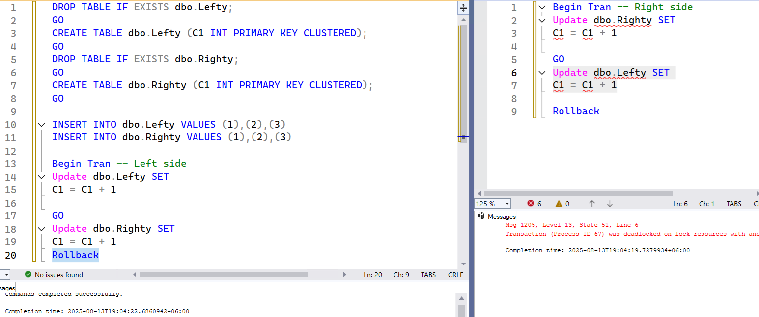 Let's open two windows in SSMS and follow below steps to produce deadlock. You will get output like figure-2.