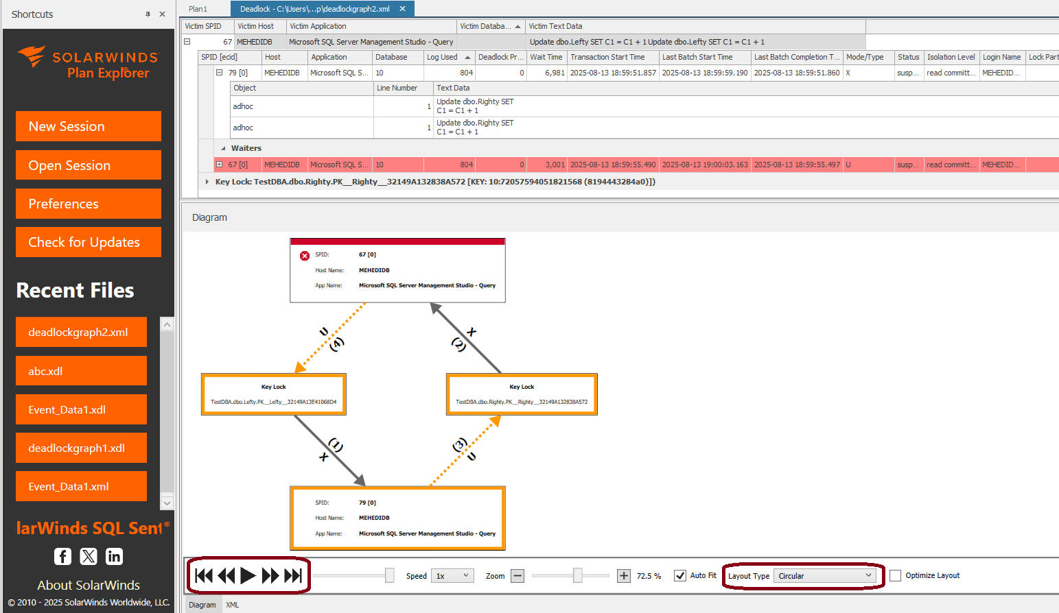 Now download and install the Plan Explorer. This is an amazing FREE tool for deadlock analysis. Open the Plan Explorer tool and open the just saved xml file from your desktop. It will be like Figure-5. You can check details info of deadlock queries and deadlock graph. Even you can re-play the deadlock by clicking bottom play button. You can adjust layout of deadlock graph also from bottom settings.