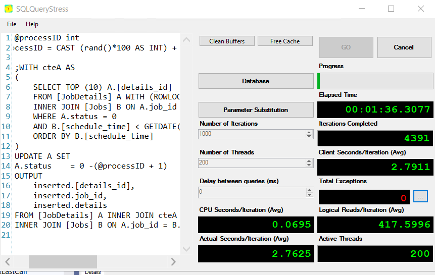 You can optimize the query using a CTE, UPDATE … OUTPUT, and proper locking hints that will eliminate the deadlocks and make the job tables stable and scalable. Now run Query Listing:-4 and Query Listing:-3 in two separate SQLQueryStress windows.